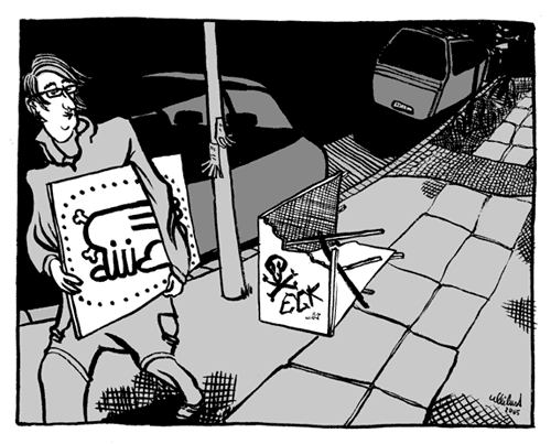 Zu recht sind Pressspanmöbel abzulehnen. Wohin damit? Auf die Straße! Wo der Eddingartist schon wartet um hippe "street-Art" darauf zu plazieren. Die dann über dem antiken Sofa landet von dem Kunstfreund, wegen dessen spöttischen Auge Du das weisse Küchenkastl zum Müll erklärt hast. Aus der Gesellschaft, DEZ. 2005 Bildkolumne aus der Berliner Stadtzeitung Scheinschlag www.scheinschlag.de Texte: Kai Pfeiffer/Ulli Lust |