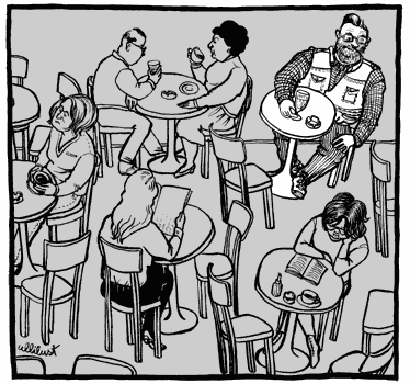 Blind Date: Seit geraumer Zeit sitzt ein rotwangiger Herr in einer Ecke des Cafe´s, von der aus er den gesamten Eingangsbereich gut überblicken kann. Jede eintretende Frau läßt ihn aufspringen »Entschuldigen Sie, sind Sie vielleicht Ingrid?«