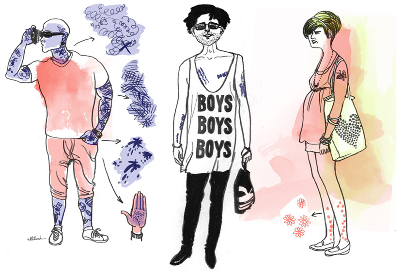 | Fashionvictims / Modeopfer 023 Tattoos are only good for distinction, when they are applied as extensively as possible. The hipster is showing off his self-mutilation, neck, hands and face are no longer a taboo. The lines of the patterns mimic every scar that a fashion-conscious cutter achieves with a cheap razorblade. Tätowierungen taugen nur mehr zur Distinktion, wenn sie möglichst großflächig aufgebracht werden. Der Hipster kokettiert mit seiner Selbstverstümmelung, Hals, Hände und Gesicht sind schon lange kein Tabu mehr. Die Linienmuster auf seinen Armen imitieren jene Narben, das sich modebewußte Ritzerinnen mit dem Rasiermesser billig selbst besorgen.