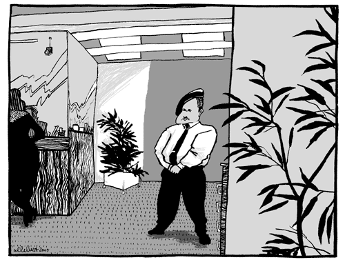 Täglich und bewegungslos steht ein beachtenswerter Zeitgenosse an seinem Platz als Wachschutzmann einer Berliner Sparkasse. Er erfüllt mit anrührender Präzision eine Tätigkeit, die eine amöbenhafte Bescheidenheit verlangt, wie sie nur ein buddhagleicher Meister der Versenkung aufzubringen versteht.