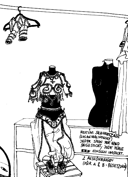 | „Auf all diese Muster hier beim Kostüm der Sheherezade nähen wir auch noch jeweils solche Steine auf, damit das noch mal ein bisschen glänzt, wenn sie sich bewegt. Die Steine reichen nicht. Ich habe hier noch 30 und ich brauche 47 für Elli´s Oberteil, für die Solomäntel und für die Gruppenmäntel." Kaum hat die Kostümbildnerin den Raum verlassen, unken die Schneiderinnen: „Bis gestern hat Ingrid nix gesagt von wegen dem ganzen Mantel-aussticken. Vielleicht hat Susan darum gebeten. Die will ja immer hervorstechen. Gestern ach, bei der Anprobe von dem Oberteil da wurde nur rumgemosert. Wär noch nicht prächtig genug! Hier noch ‘n Goldkettchen dran und da noch ein paar Perlen drauf, das habe ich alles noch heute angenäht." |